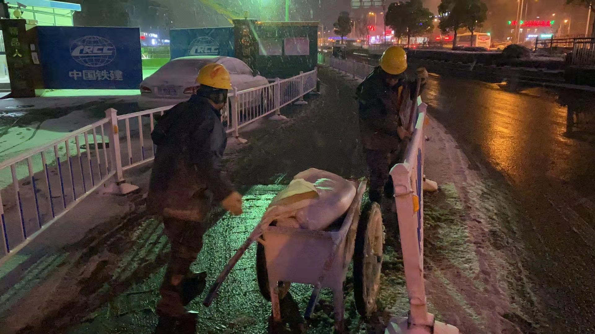 夜间保工地周边“自留地”,清晨保行人密集“公共地”,七号线TA03标上的老王夜间连续4个小时在工地周边道路上撒盐、除雪 。清晨来临,项目经理叫他去休息的时候,他说他浑身是劲,抄起铁锹一溜烟又跑到人流量较大的路口去铲雪。
