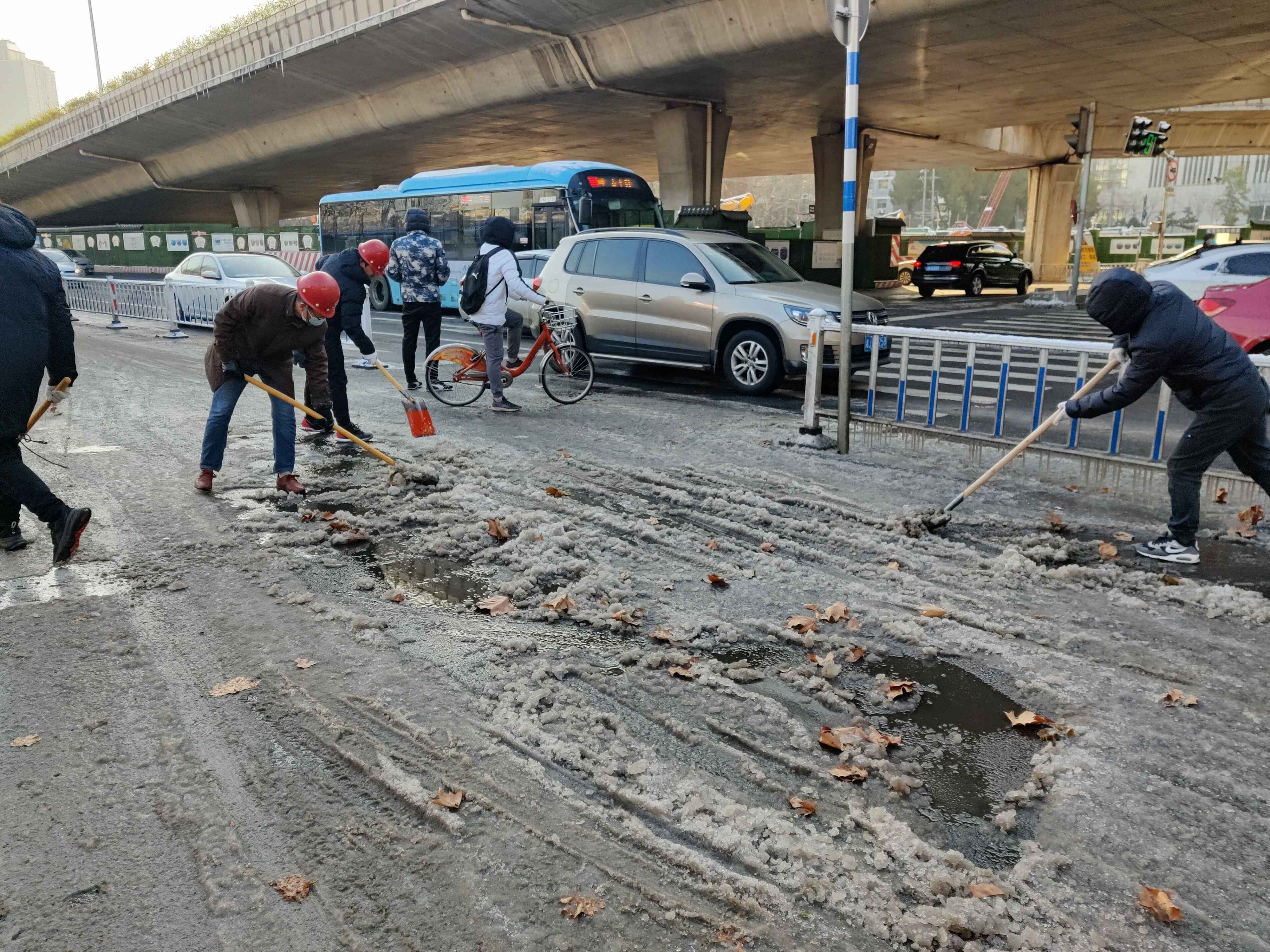 迎难而上,专挑人口密集场所进行除雪,从行人密集的地铁口到机动车辆、非机动车辆密集的主干道,哪里行人多、车辆多,哪里就有他们的身影。