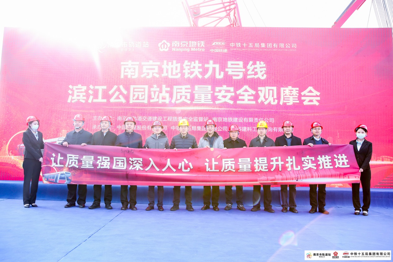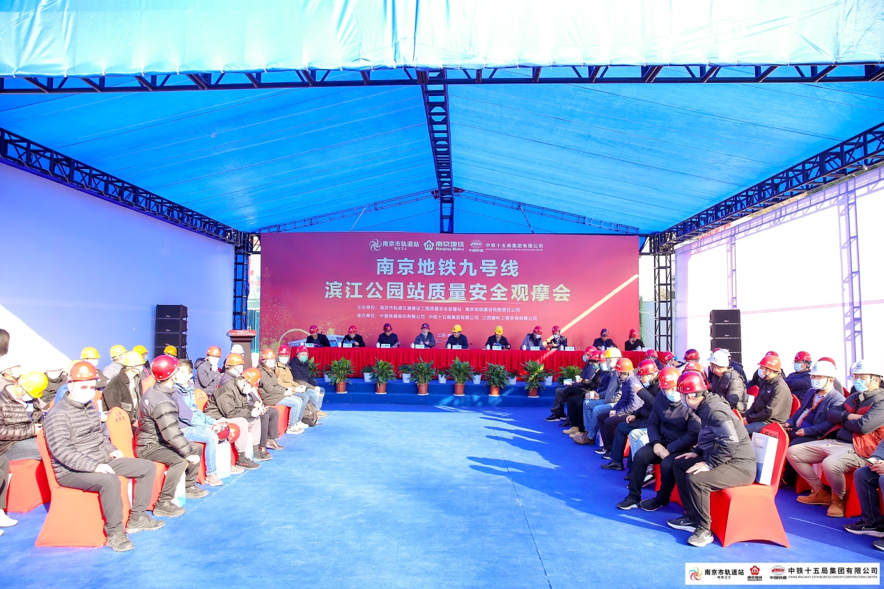 为强化工程质量安全监管,发挥样本示范引领作用,持续提高工程质量安全管理水平,12月15日上午,2021年度南京市轨道交通工程质量安全观摩会在南京地铁九号线滨江公园站成功举办。此次活动由南京市轨道交通建设工程质量安全监督站主办、中铁十五局集团有限公司承办,这也是继六号线金陵石化站观摩活动后,又一场“现场观摩+线上直播云观摩”形式的观摩会。南京市建委党委副书记、副主任朱家祥,南京市轨道站站长蓝桂华,南京地铁建设有限责任公司副总经理郁犁等领导及全市各在建线路施工、监理单位约40名代表参加了现场观摩。