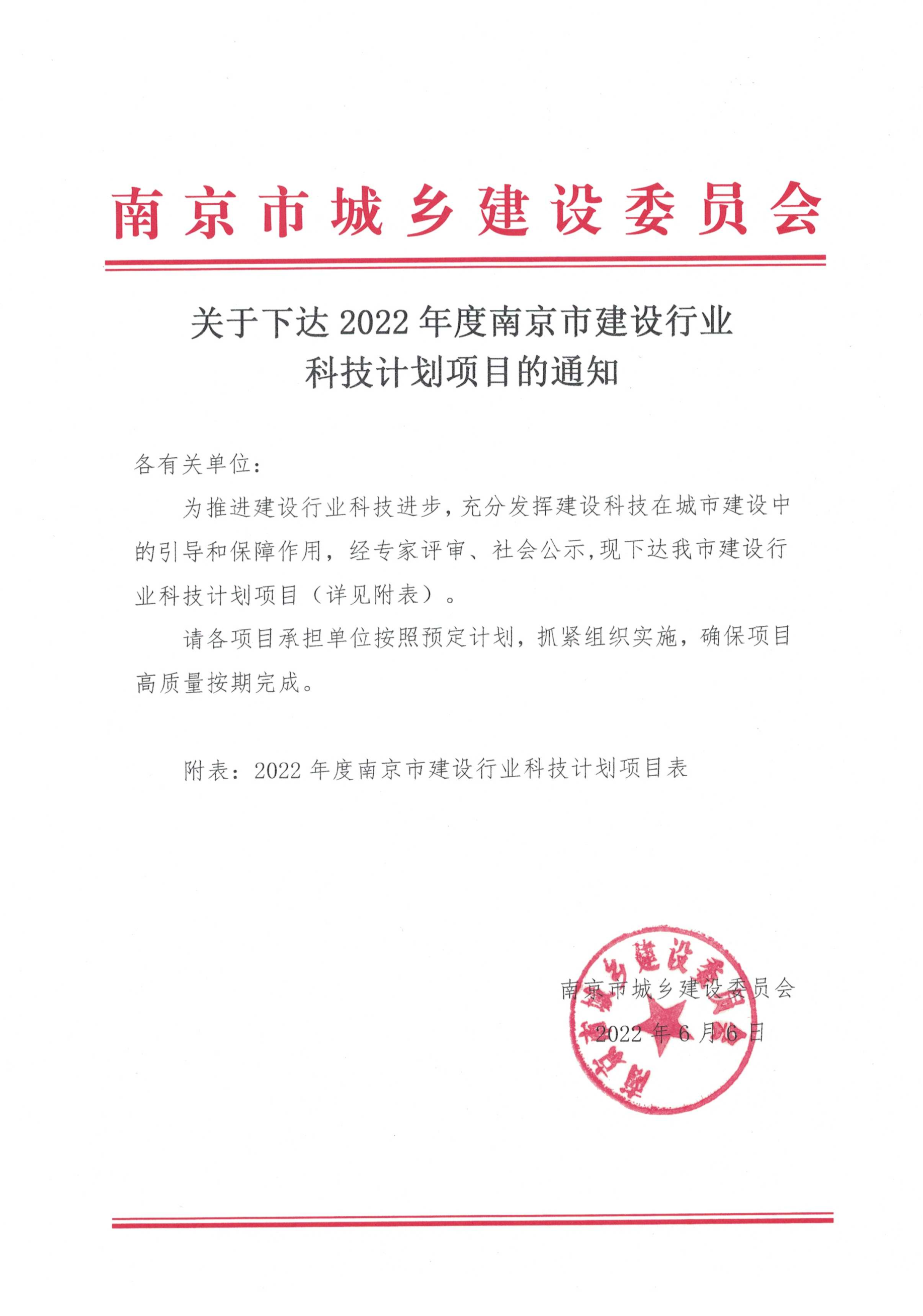 关于下达2022年度南京市建设行业科技计划项目的通知