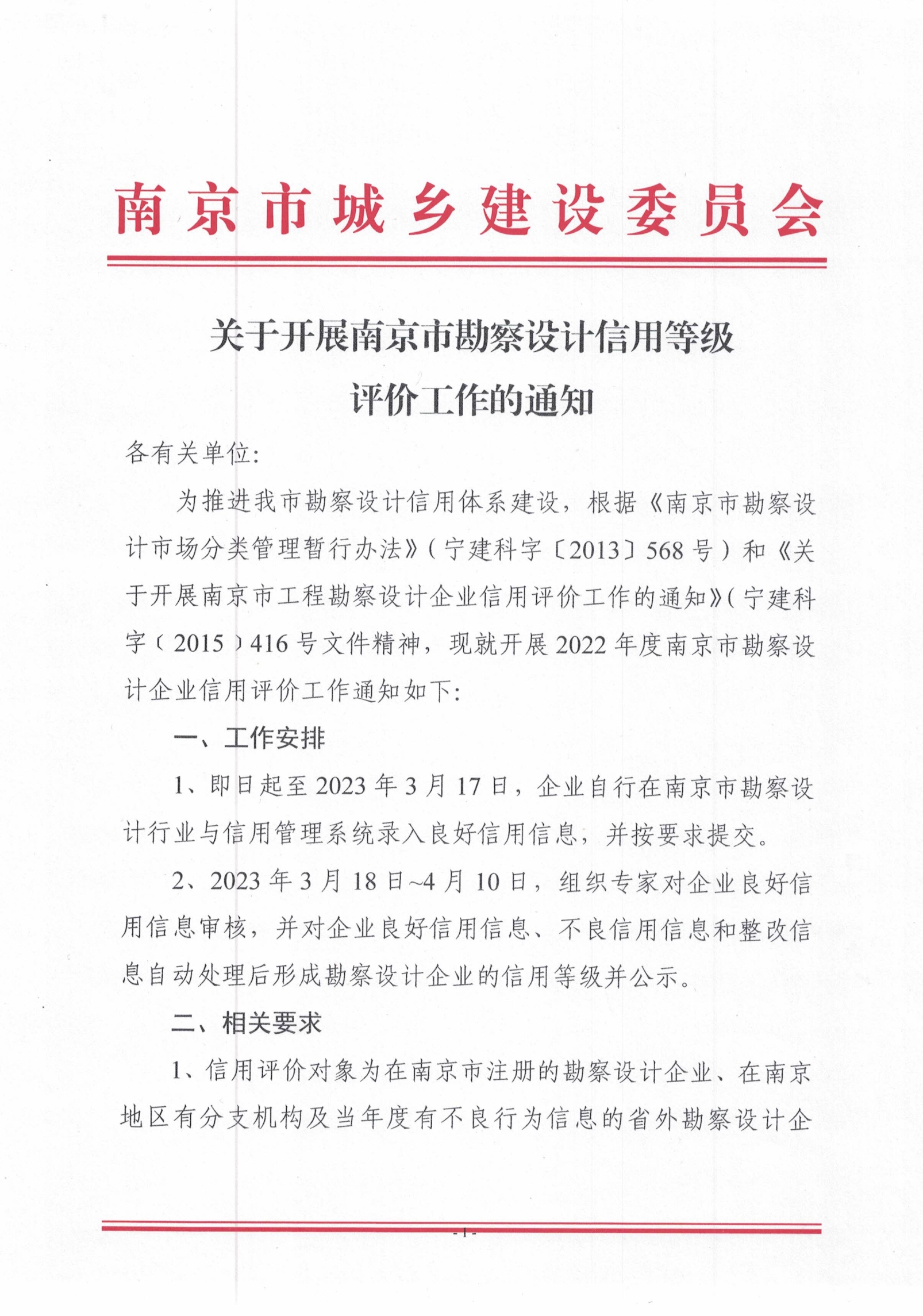 关于开展南京市勘察设计信用等级评价工作的通知