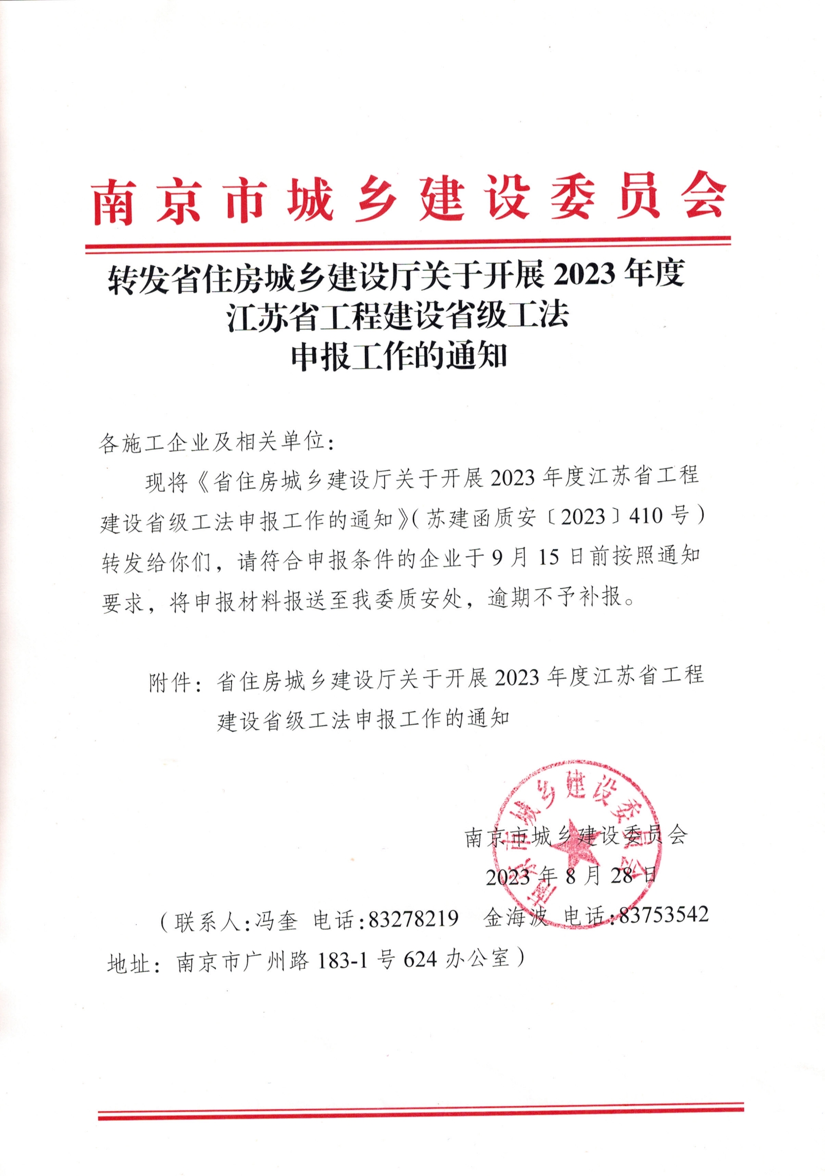 转发省厅关于开展23年度江苏省工程建设省级工法申报工作的通知