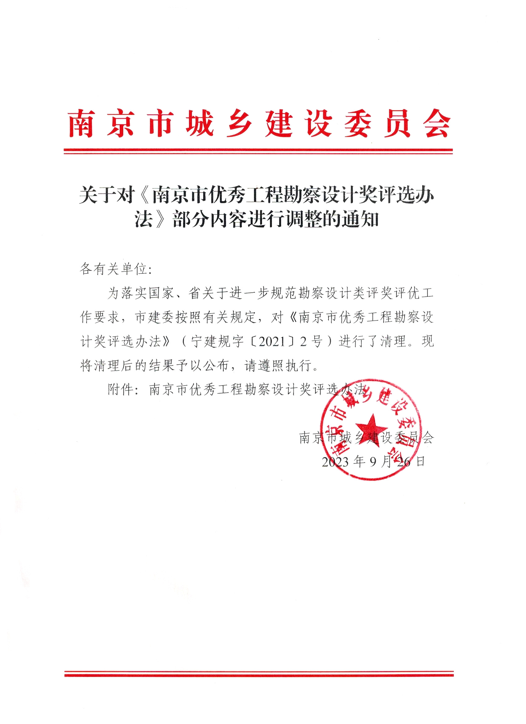 关于对《南京市优秀工程勘察设计奖评选办法》部分内容进行调整的通知