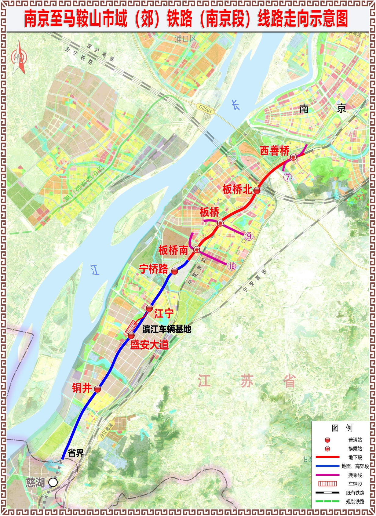 宁马城际(南京段)起自西善桥站,沿宁芜公路、景明大街敷设至省界,线路主要途经雨花台区、江宁区、滨江开发区,线路全长26.51千米,其中地下线11.663千米、高架线14.847千米。全线共设8座车站,其中地下站4座、高架站4座,共投入7台盾构机施工。