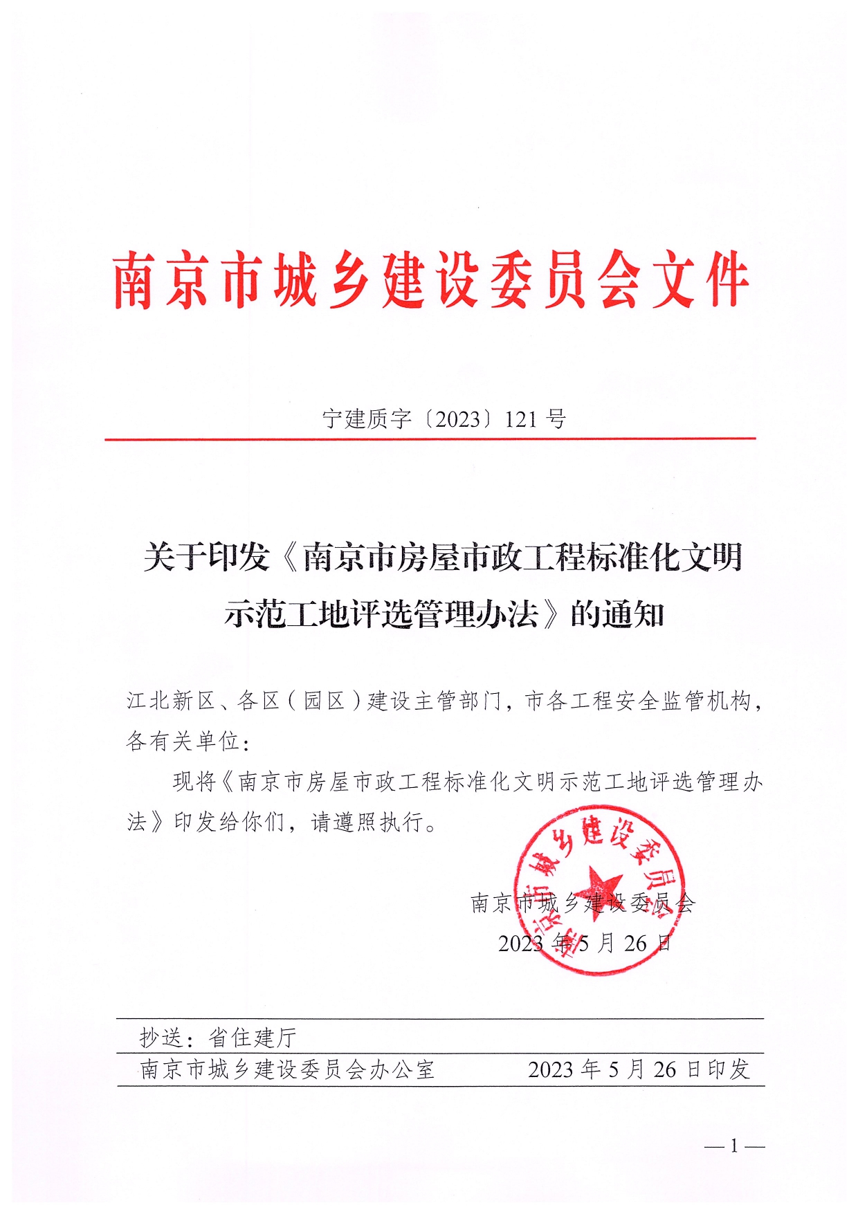 关于印发《南京市房屋市政工程标准化文明示范工地评选管理办法》的通知(宁建质〔2023〕121号)