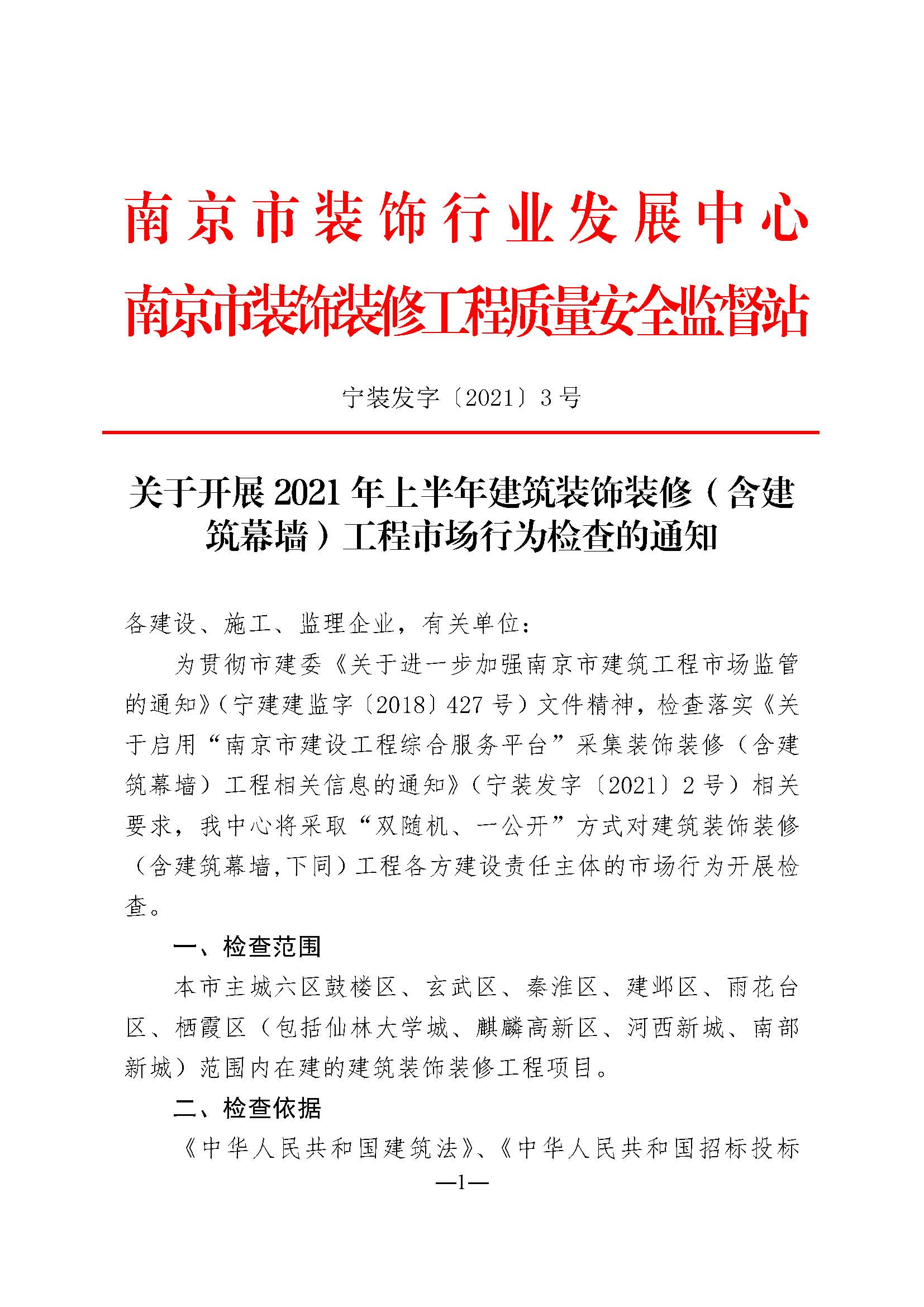 关于开展2021年上半年建筑装饰装修(含建筑幕墙)工程市场行为检查的通知