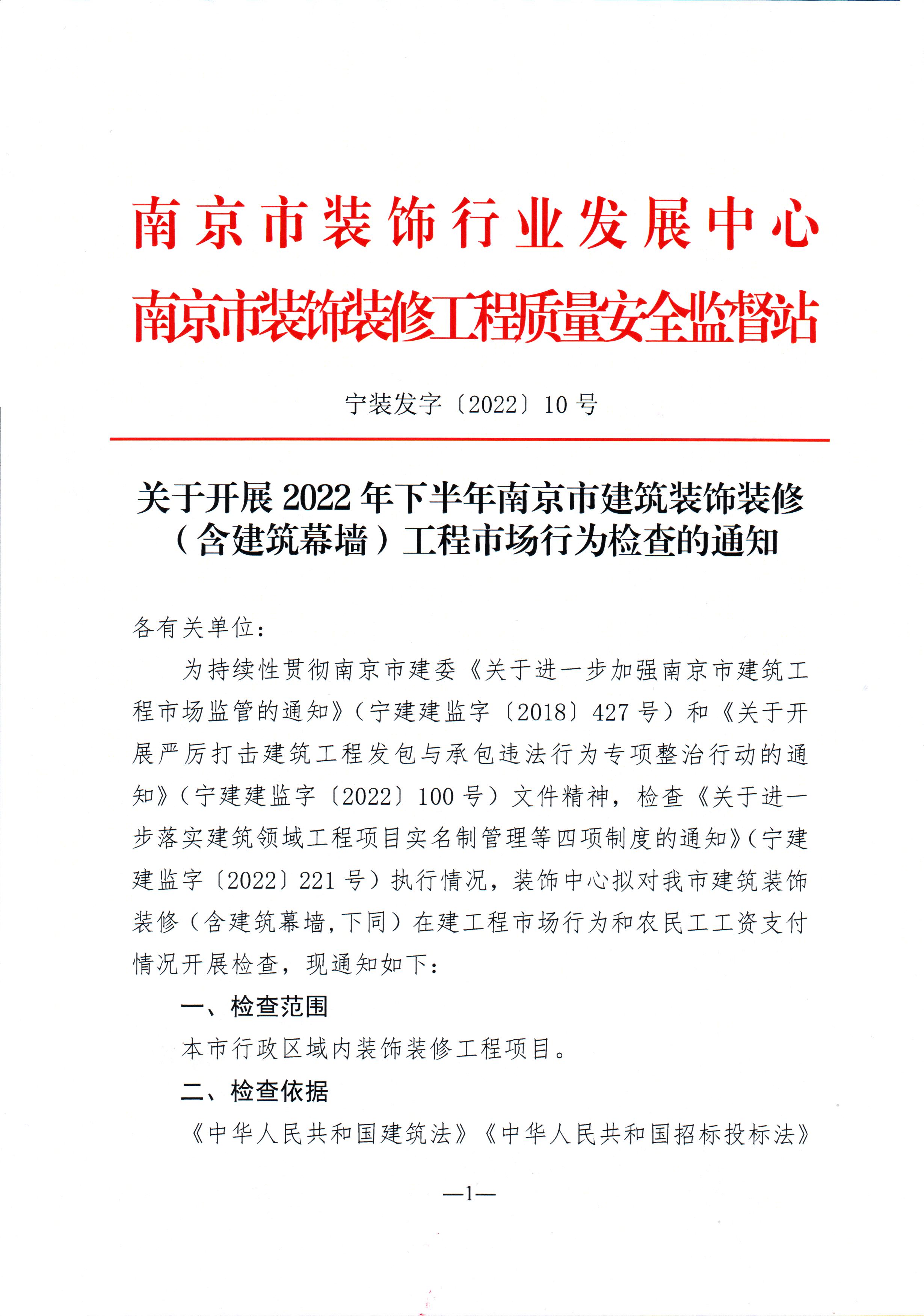 关于开展2022年下半年南京市建筑装饰装修(含建筑幕墙)工程市场行为检查的通知