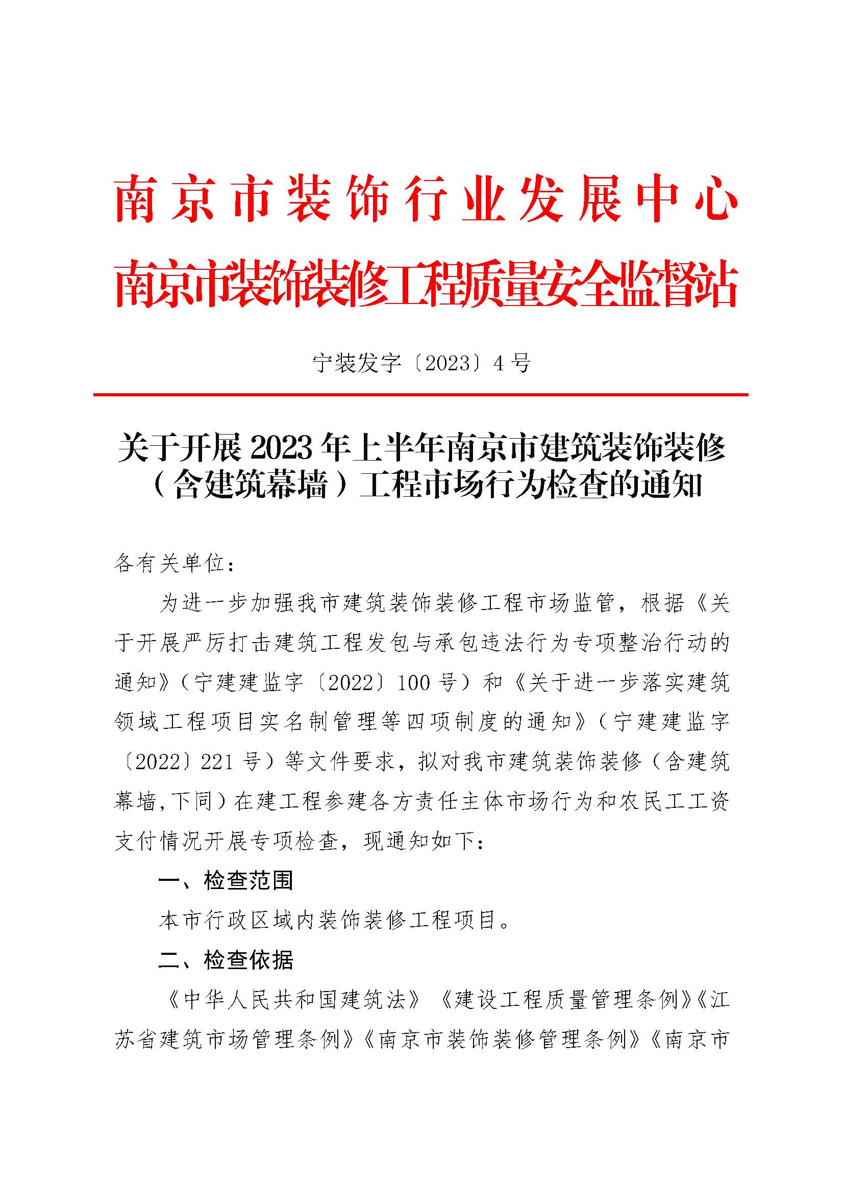 关于开展 2023 年上半年南京市建筑装饰装修(含建筑幕墙)工程市场行为检查的通知